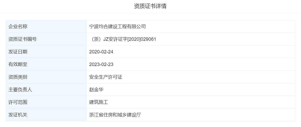 宁波均合建设工程有限公司于2020年02月24日,经由浙江省住房和城乡建设厅许可下发安全生产许可证