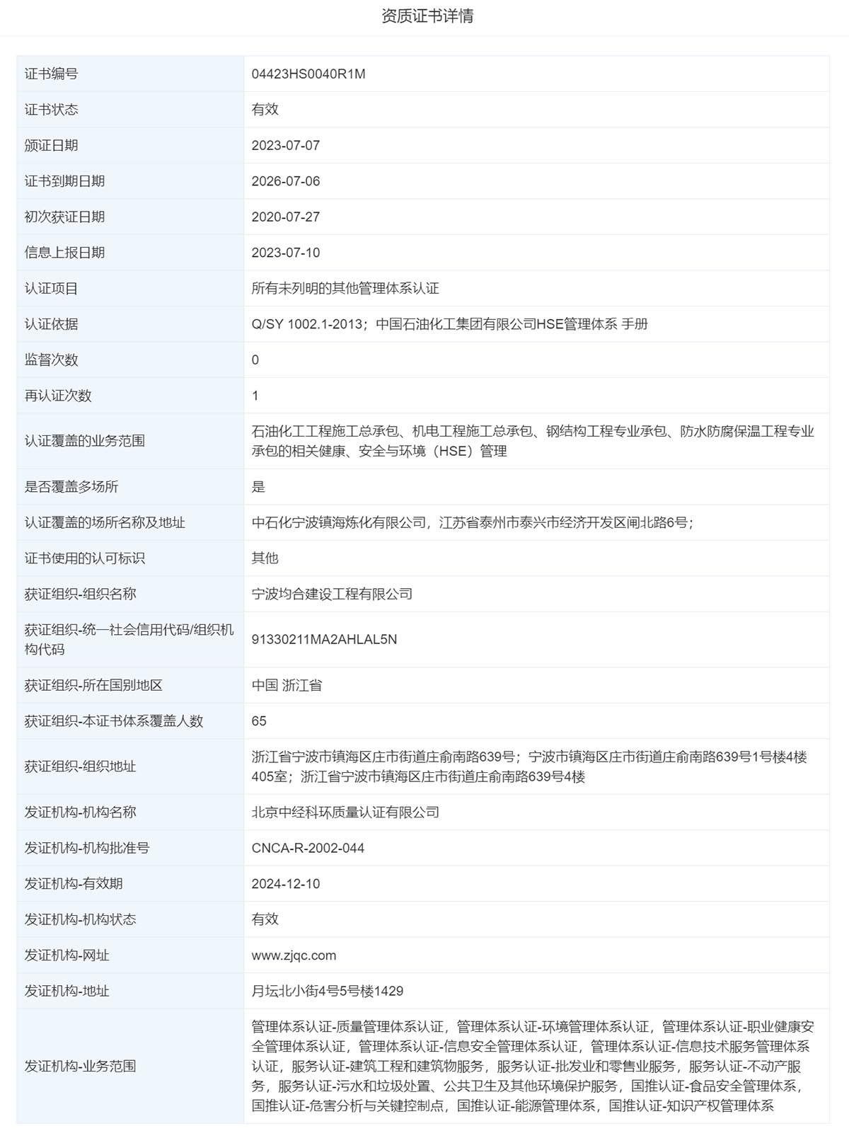 宁波均合建设工程有限公司于2023年07月07日,通过所有未列明的其他管理体系认证