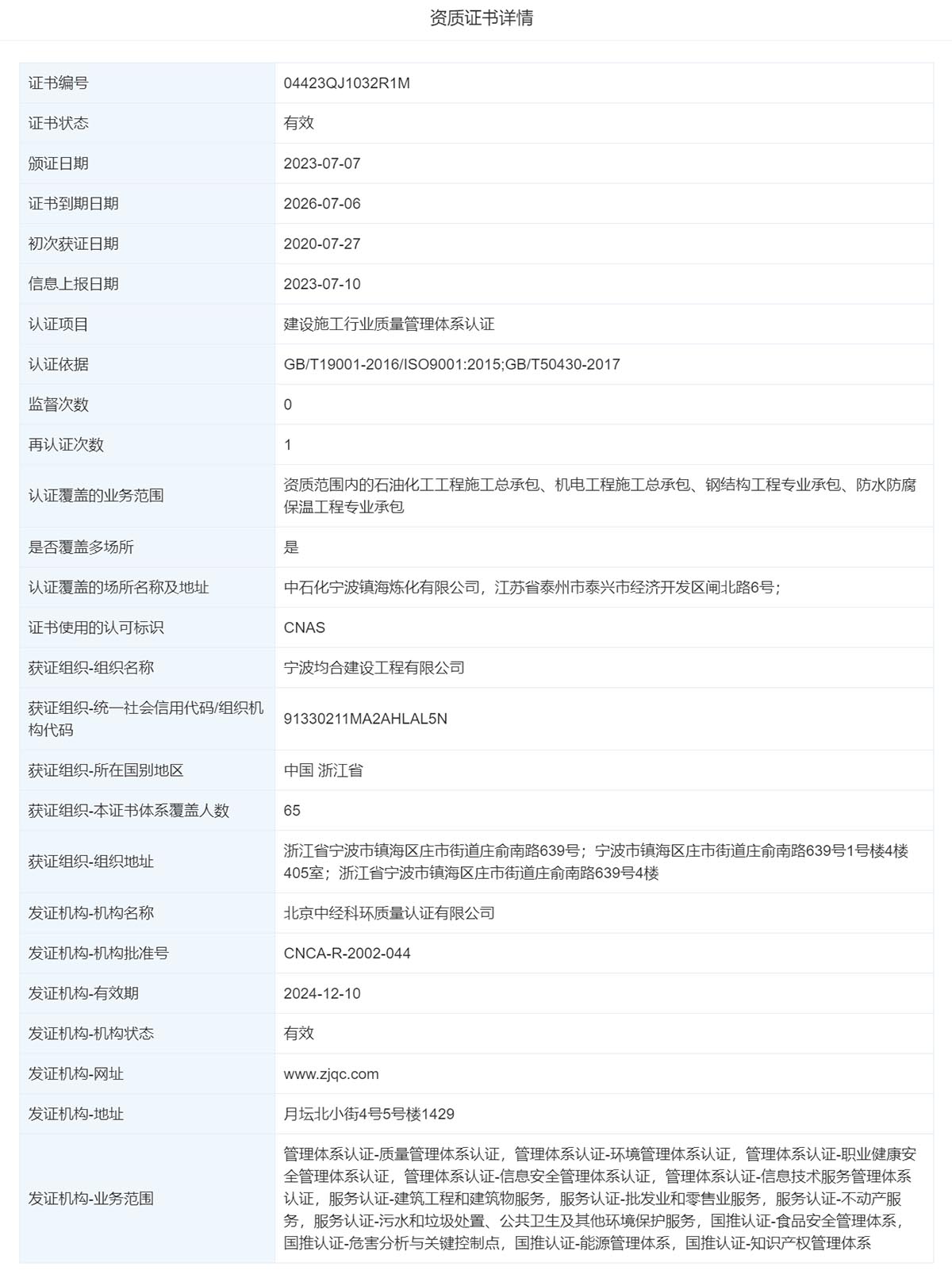 宁波均合建设工程有限公司于2023年07月07日,通过建设施工行业质量管理体系认证